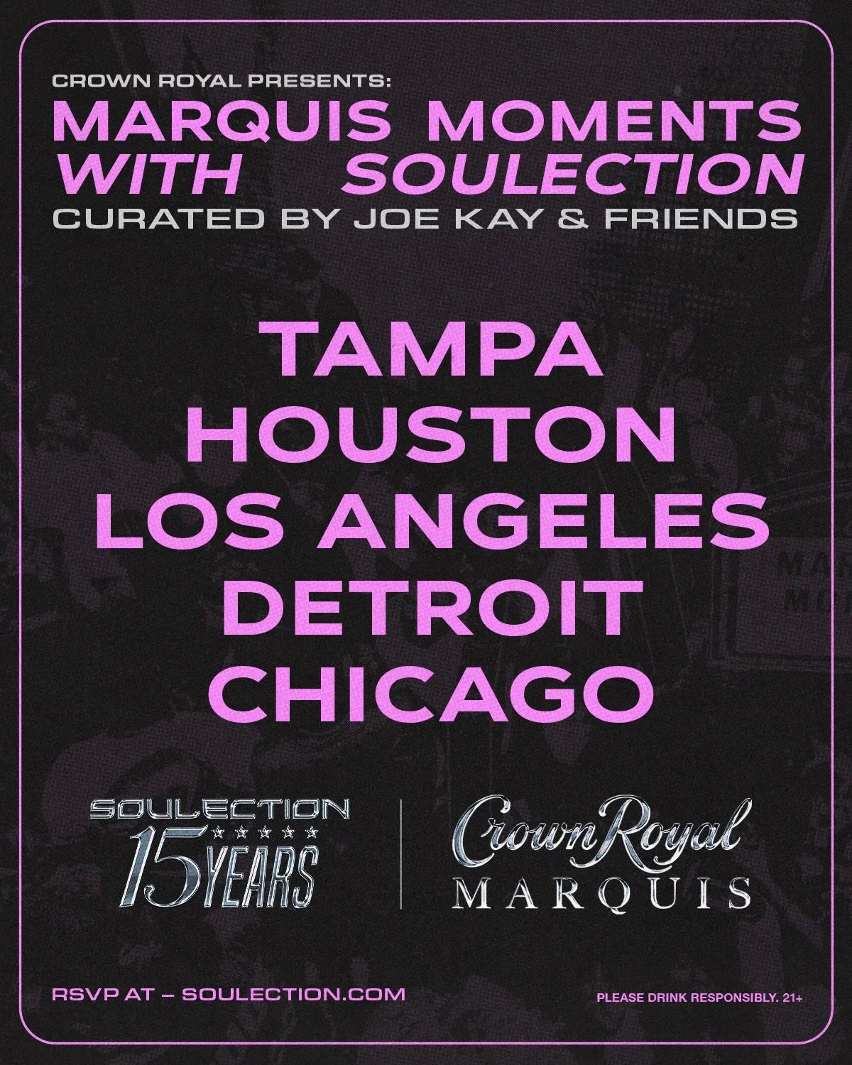 Crown Royal Marquis partners with Joe Kay and Soulection to launch ‘Marquis Moments with Soulection,’ a multi-city series of curated listening lounges celebrating the collective’s 15-year anniversary in Los Angeles, Houston, Chicago and more.